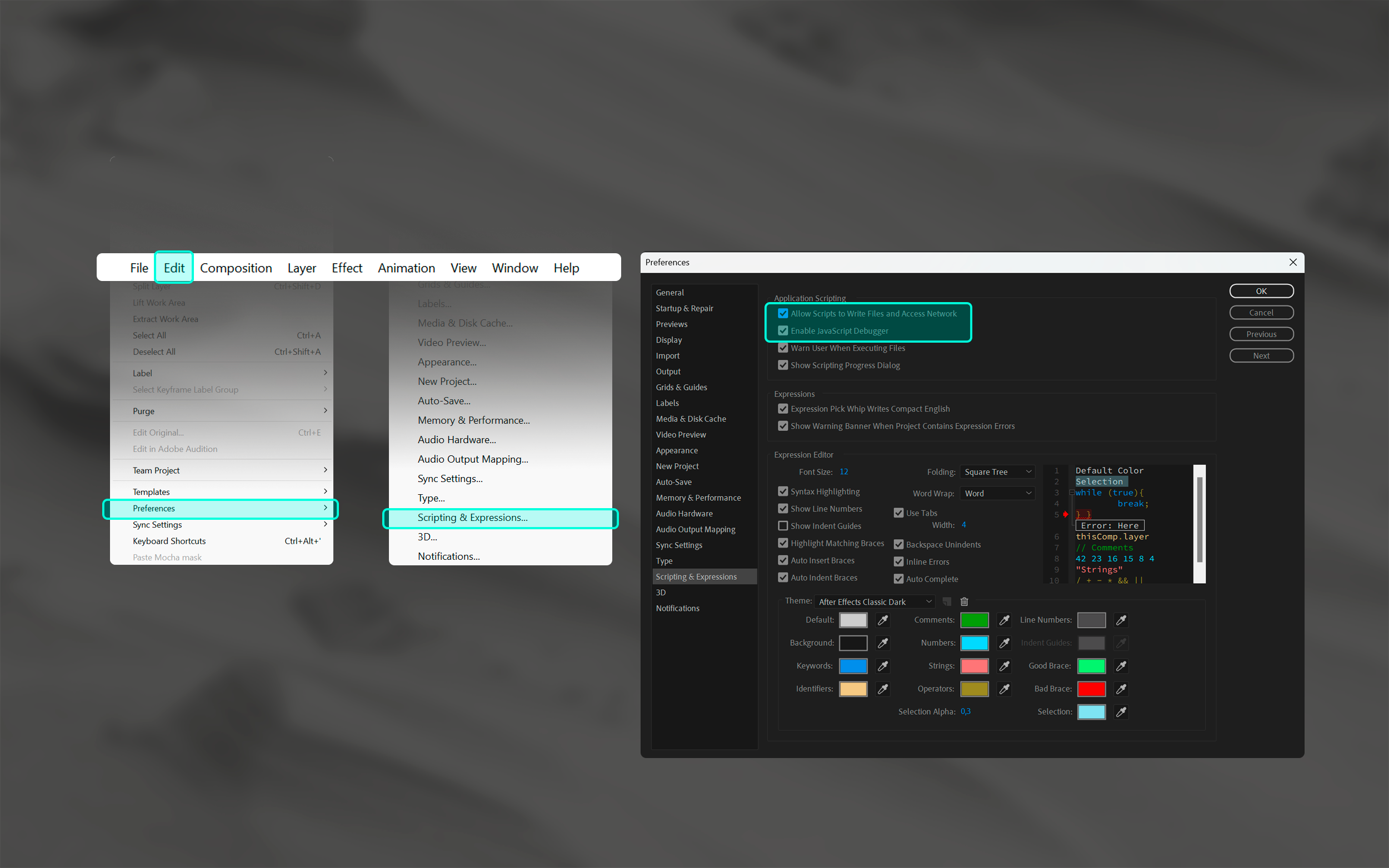 Uma expressão no After Effects é um modificador aplicado a uma propriedade de um objeto para animar automaticamente a propriedade sem usar quadros-chave. É preciso habilitar, conforme imagem abaixo, para que o After Effects interprete seus códigos.